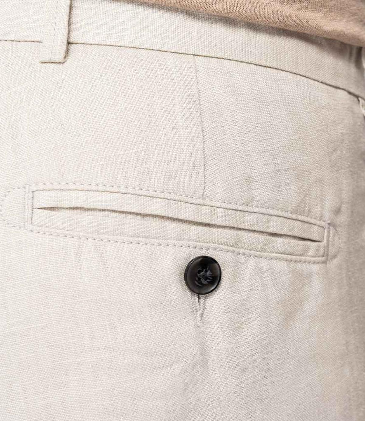 - Rear piped pockets with recycled plastic buttons.